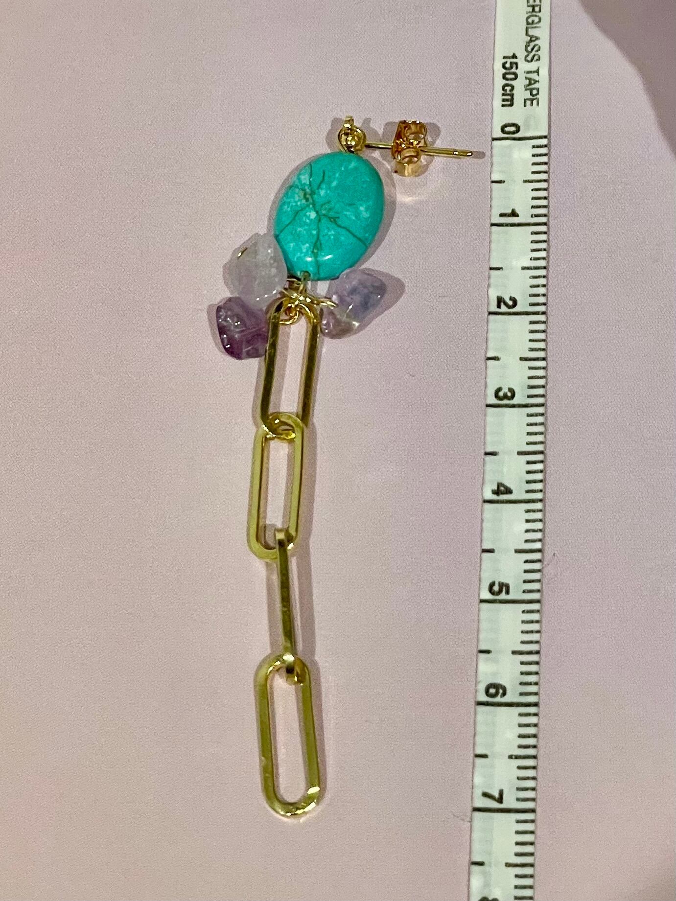 ターコイズ、アメジストの組み合わせと、シェルムーン、クロス、淡水パールを組み合わせた、左右非対称のデザイン。