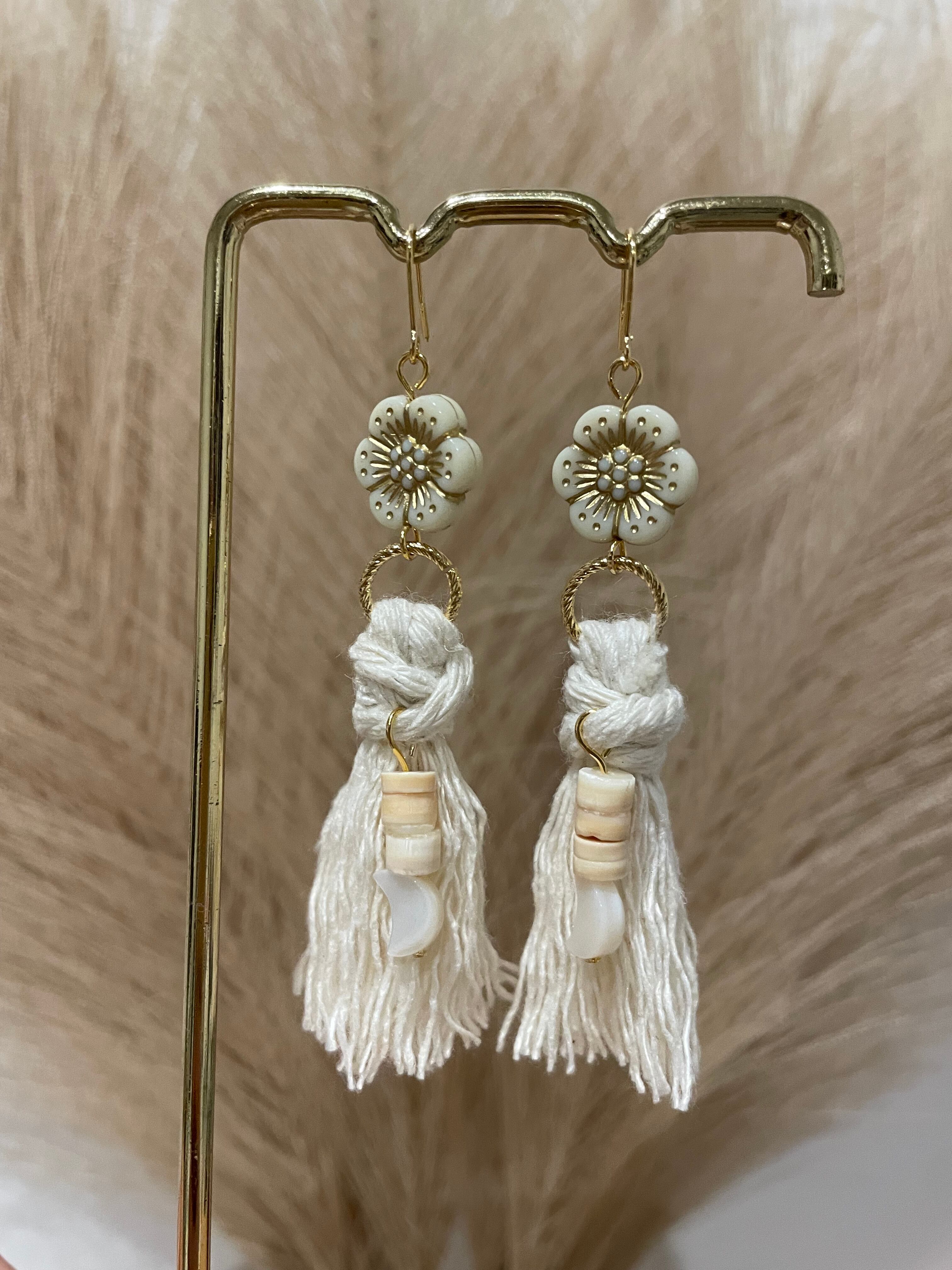 オーガニックコットンタッセルとフラワービーズ、シェルビーズを組み合わせた、ナチュラルで華やかなデザインの16kgfピアス&イヤリングです✨